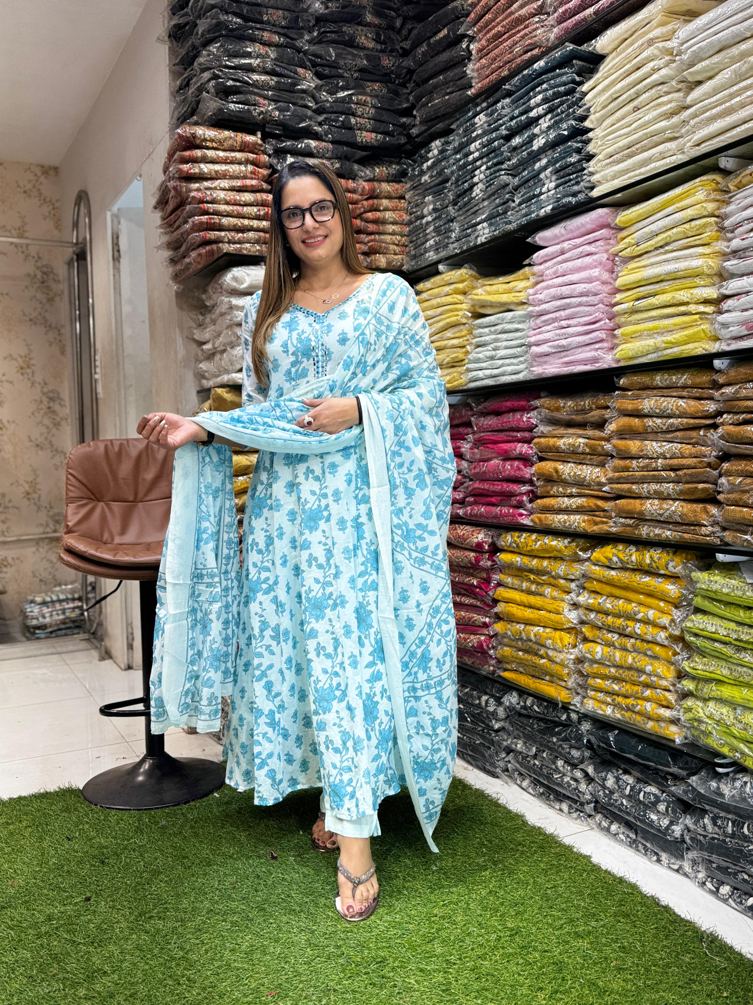 Mull Cotton Anarkali Blue 3pc Set